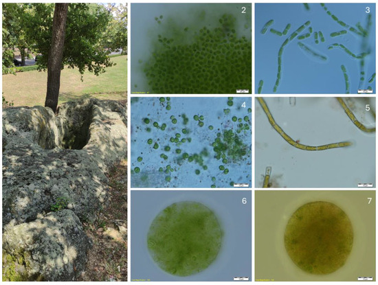 Megalithic complex Gluhite Kamuni (part of the complex with wall niches—(1)) and some algae growing in the obtained cultures: Aphanothece cf. saxicola (2), Nostoc linckia and Chloroideum ellipsoideum (arrow) (3), Klebsormidium klebsii (4), Sphaerococcomyxa olivacea and Pseudostichococcus monallantoides var. exiguus (arrow) (5), Printzina lageniforme (6), and Trentepohlia cf. jacunda (7).