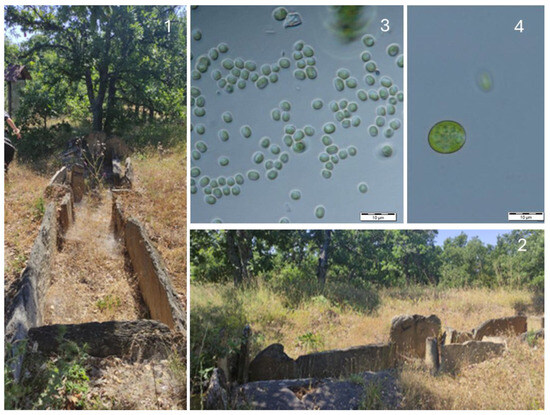 Field investigations of megaliths in Bulgaria began in the late 19th–early 20th century and continue to this day [45]. There are different opinions about the age of these ancient constructions: Most scholars date them to the Iron Age (1200–500 BC), while for some of them, the earlier Chalcolithic period (5000–3500 BC) has been hypothesized [41]. Studies have been carried out by historians, archaeologists, paleoastronomers, geographers, and geologists, but up to date, the megaliths located in Bulgaria have not been the focus of phycologists. This should be seen in the context of the numerous phycological studies which started at the end of the 19th century [46] and led to the identification of about 500 aeroterrestrial algae from soils, rocks, caves, tree barks, mosses, plants, and snow, representing 1% of the total algal biodiversity in the country [6,8,47].