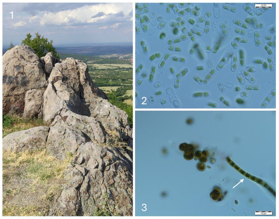 Currently, problems affecting aquatic systems and organisms related to rapidly advancing climate changes and eutrophication are recognized worldwide, and scientific publications on these topics appear in emerging ways. However, much less attention is paid to the effects of both expanded eutrophication of the atmosphere (caused by increased nitrogen compounds and hydrocarbons) and of global warming on the land, aeroterrestrial environments, and their inhabitants [1]. More than 1000 algae, both prokaryotic and eukaryotic, form an important part of the rich aeroterrestrial microbial life on hard natural substrates such as soils, rocks, stones, tree barks, and different manufactured surfaces, including fences, roofs, building facades, and monuments [1,2,3]. However, they are much less studied compared to their aquatic counterparts [1,4] mainly because their reliable identification requires time-consuming and labor-intensive cultivation-dependent methods [5,6]. Nevertheless, interest in these organisms has been increasing over the years for several reasons: (1) they serve as an essential organic-matter basis for heterotrophic organisms due to their photosynthetic ability and their role as primary producers [7]; (2) living in outdoor habitats, they are directly exposed to all adverse environmental factors and include some rare and threatened species (e.g., [8]); (3) there is currently increasing evidence that is useful for modern biotechnology, food industry, medicine, pharmacy, cosmetics, etc. [4,9,10]; (4) some of them are able to synthesize toxic substances that are harmful for ecosystem and human health [11,12]; (5) there is a currently growing interest to non-suspended, attached cultivation that offers higher biomass yields, better control of contamination, and lower water consumption compared to ordinary suspended photobioreactors [13,14]; (6) in the long term, algae, together with all other inhabitants of hard substrates (e.g., bacteria, mosses and lichens), play a destructive role in their physical weakening and color changes during a biological weathering process, also known as bioerosion or biodeterioration [1,7,15,16,17,18,19,20,21,22,23].