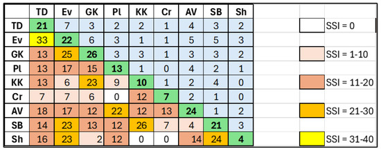 The floristic similarity between the nine studied megaliths is represented by Sørensen’s Similarity Index (SSI). The number of species in each megalith is shown with bold numerals on the diagonal (green). Above the diagonal, the number of common species for each two megaliths is shown (light blue), and below the diagonal the values of SSI are shown, grouped into five classes through 10%. Abbreviations indicate the megaliths: KD—Tsarski Dolmen, Ev—Evdzhika, GK—Gluhite Kamuni, Pl—Plevun, KK—Kovan Kaya, Cr—Cromleh, AV—Angel Voyvoda, SB—Stupkata na Bogoroditsa, Sh—Sharapanite.