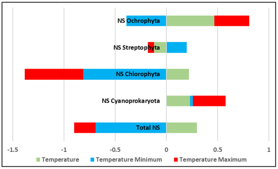 Correlations between the temperatures of the nine studied megaliths (minimum and maximum for each megalith, and by samples,) and algal biodiversity (total and by taxonomic phyla) represented by values of the correlation coefficients (when p < 0.05). NS—number of species.