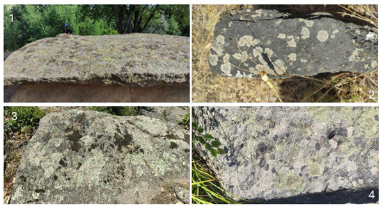 Examples of megalith surfaces covered by lichens exemplified by parts of (1) Tsarski Dolmen; (2) Megalith Plevun; (3) Cromleh; and (4) Angel Voyvoda.