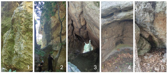 Examples of megalith surfaces with visible algal layers: (1,2) different parts of the Gluhite Kamuni with visible green layers on the outer surfaces of the sandy rocks in the deciduous forest; (3) Open rock pass Utrobata (which in the Bulgarian language means Uterus) in the complex Gluhite Kamuni with greenish layers in the inner parts; (4) inner part of the Evdzhika with well-developed green layer; (5) inner part of Stupkata na Bogoroditsa with visible green algal layers.
