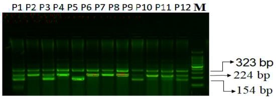 The PCR reaction was carried out in a reaction vol. of 12 μL, which was composed of four primers: Fo (0.10 μL), Ro (0.10 μL), FI (0.10 μL), RI (0.10 μL) (25 pmol of each primer), and 6 μL of green PCR Master Mix (2×) (Cat M712C) (Promega, Madison, WI, USA). The final volume of 12 μL was achieved by using nuclease-free ddH2O. Template DNA (50 ng) was added at the end.