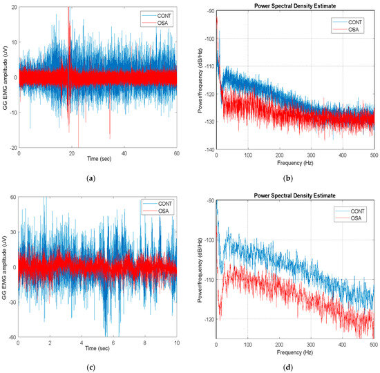 Example of acquired GG EMGs from control and OSA subjects: in resting (top panel) and active states (bottom panel). In both cases, control subject showed higher magnitude of GG EMG than OSA patient, as observed on time (a,c) and frequency spectra (b,d).
