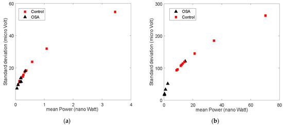 Mean power and standard deviation for EMG signal of control vs. OSA in resting (a) and active states (b).