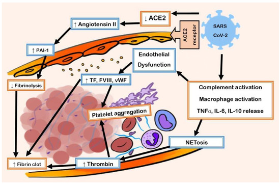Venous and arterial thrombosis have been extensively reported in patients infected with SARS-CoV-2. Various organs are affected by COVID-19 vasculopathy, including the vasculature of lungs [1], legs [2], spleen [3], heart [4], and brain [5]. These thromboembolic complications are often associated with multiorgan failure and high morbidity and mortality. The most frequently noted thrombotic events in COVID-19 are deep vein thrombosis (DVT) and pulmonary embolism (PE) [6]. The risk of venous thromboembolism (VTE) is high in hospitalized patients despite anticoagulation prophylaxis, with a 20–69% DVT/PE rate reported [7,8,9,10,11]. Other vascular clinical manifestations include stroke, acute limb ischemia, and myocardial infarction [5,12,13]. This review will summarize the mechanisms by which SARS-CoV-2 infection can lead to thromboembolic events.
