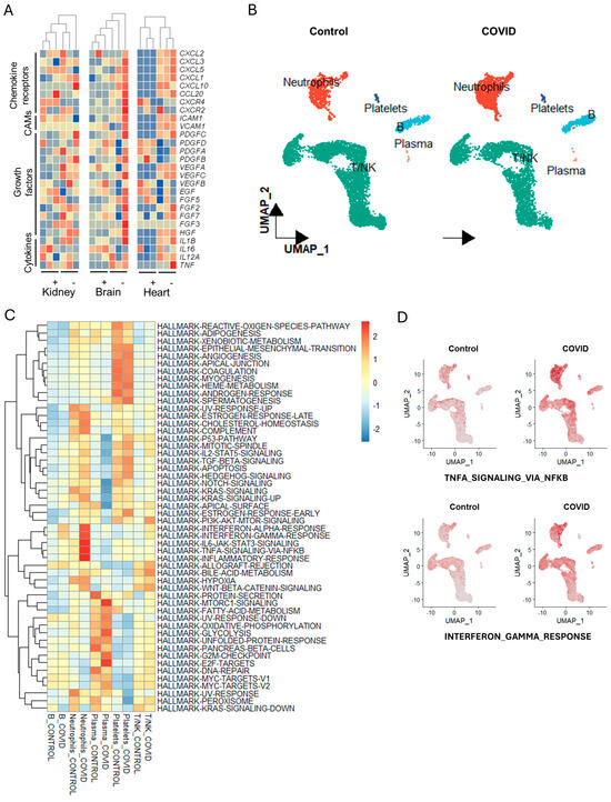 (A) Heatmap of immune response-related genes in adult cardiomyocytes, choroid plexus organoids, and human embryonic kidney cells. Blue indicates low expression, while orange indicates high expression. +/−, with/without SARS-CoV-2 infection. (B) UMAP plot of cell cluster in COVID and control group. (C) Pathway enrichment analysis with HALLMARK database in different cell types between COVID and control group. (D) Feature plot of key immune pathways in different groups.