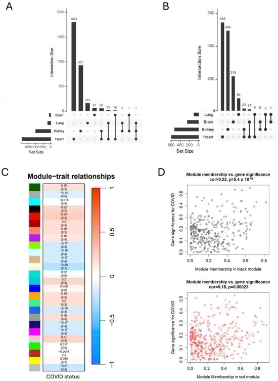 WGCNA analysis across different organs. (A) Upset plot of common upregulated DEGs in different organs. (B) Upset plot of common downregulated DEGs in different organs. (C) Relationship of module genes with COVID status. (D) Correlation of key module genes with COVID status.