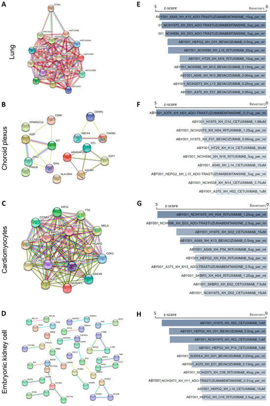 PPI network and predicted candidate antibodies. (A–D) PPI network analysis of top 15 hub genes by STRING. (E–H) Prediction of candidate antibody by LINCS l1000 antibody perturbations database. Ranking by z-score.