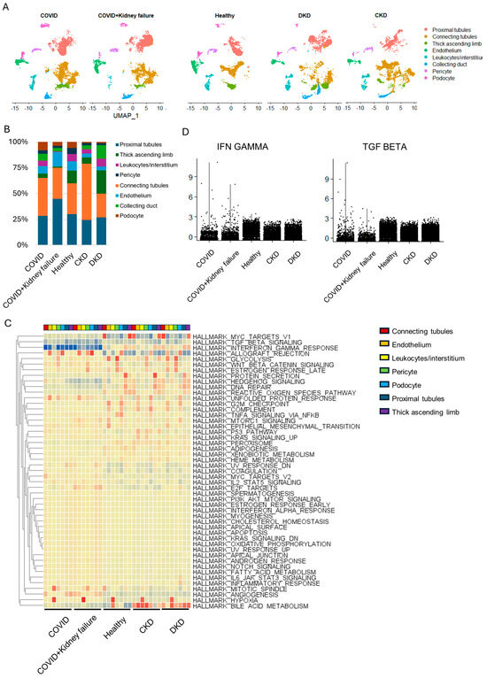 COVID-19 can lead to respiratory failure and other organ failure due to a hyperinflammatory response [76]. The relationship between kidney failure and COVID-19 is complex and involves a combination of direct viral effects, systemic inflammation, hypoxia, coagulation abnormalities, and treatment-related factors [19]. It underscores the importance of monitoring kidney function in COVID-19 patients and implementing strategies to prevent and manage kidney complications. Chronic kidney disease (CKD) and diabetic kidney disease (DKD) are two prevalent and interconnected conditions that significantly impact overall health, leading to kidney failure. The interplay between CKD, DKD, and immune activity is complex and multifaceted. Both conditions contribute to an altered immune response, rendering patients more susceptible to infections, impaired wound healing, and chronic inflammation [77,78]. To elucidate the complex effects of kidney dysfunction on immune activity, we integrated single-cell RNA-seq datasets from three COVID-19 patients, three COVID-19 patients with concurrent kidney failure, three CKD patients, three DKD patients, and six healthy controls for further analysis (Figure 4A) [30,31]. Although there was a slight change in the ratio of different epithelial cells, the overall proportion of epithelial cells was not significantly affected (Figure 4B). There was a decrease in leukocytes in patients with kidney failure, CKD, or DKD. Unlike the rapid immune response during the early infection stage, a gene set enrichment analysis showed that patients with long-term COVID-19 exhibited significantly reduced immune activity (Figure 4C), especially in IFNγ and TGFβ (Figure 4D), while other metabolic pathways were not significantly changed. Additionally, we observed reduced immune activity in COVID-19 patients with kidney failure compared to those without kidney failure. Moreover, patients with CKD and DKD exhibited a compromised immune response compared to healthy individuals (Figure 4D). These results indicate that long-term kidney dysfunction could render patients more susceptible to COVID-19 infection.