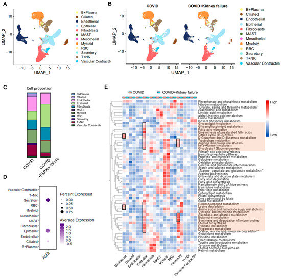 Single-nucleus RNA-seq analysis of lung samples in COVID-19 patients. (A) UMAP plot of specific cell-type clusters. (B) UMAP plot of cell types in COVID and COVID + kidney failure groups. (C) Cell proportion in different groups. (D) Dot plot of ACE2 expression in different cell types. (E) Gene set enrichment analysis of metabolic features in different cell types between COVID and COVID + kidney failure groups. Red color indicates upregulation in COVID group. Black rectangles and red boxes indicate the highly expressed pathways in the COVID group.