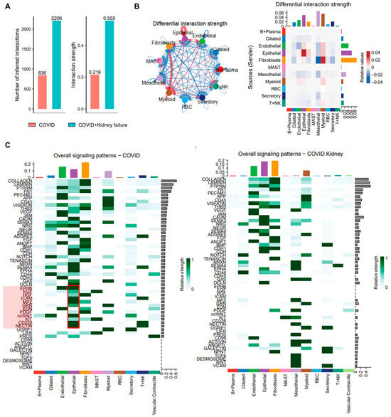 Cell–cell interactions of lung samples in COVID-19 patients. (A) Overview of the number and strength of cell–cell interactions in different groups. (B) Chord plot (left) and heatmap of cell–cell interaction in different groups. Red color indicates upregulation in COVID group. Blue color indicates upregulation in COVID + kidney failure group. (C) Comparison of overall signal pattern in different groups. Red color indicates upregulation in COVID group. Red boxes indicate the highly expressed signaling patterns in the COVID group.