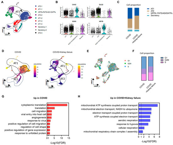 As ACE2 was mainly expressed in secretory and epithelial cells (Figure 5D), we isolated these epithelial cells for further analysis. The epithelial cells could be divided into alveolar type 1 cells (AT1), alveolar type 2 cells (AT2), and KRT8 + PATS (KRT8+ pre-alveolar type 1 transitional cell state) cells based on specific marker expressions (Figure 7A,B). In the COVID + kidney failure group, there was a relatively higher proportion of AT2 cells and a lower proportion of AT1 cells (Figure 7C). Furthermore, a trajectory analysis revealed that the AT1 cells in the COVID + kidney failure group were less mature (Figure 7D). These results suggest de-differentiation of AT1 cells in COVID-19 patients with kidney failure, potentially resulting in an impaired gas exchange ability. A cell cycle analysis showed that the COVID + kidney failure group contained more S-stage cells but less G1-stage cells (Figure 7E,F), indicating a higher proliferation activity and less matured epithelial cell state. We further filtered the DEGs between the COVID and COVID + kidney failure groups with |log2FC| > 0.25 and p-value < 0.01. The functional annotation of up/down DEGs were analyzed on DAVID. The cytoplasmic translation, viral entry into the host cell, response to the virus, and regulation of cell migration pathways were highly enriched in the COVID group (Figure 7G), implicating a more active immune response. However, the COVID + Kidney failure group exhibited a cellular stress state with upregulation of the mitochondrial pathways (Figure 7H). A previous clinical study reported that COVID-19 patients undergoing hemodialysis exhibited a more significant reduction in serum inflammatory cytokines compared to other COVID-19 patients [65]. This finding is consistent with our results, and one possible reason could be the changes in cell proportions and lung epithelial de-differentiation.