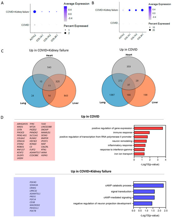 Next, to further confirm the fibrosis in hepatocytes (Figure 10A) and lung epithelial cells (Figure 10B), we compared the key fibrosis genes with a dotplot. Surprisingly, these genes were highly increased in these two cell types of COVID-19 patients with kidney failure, indicating broad fibrosis. We did not observe significant compromise of immunity in the hepatocytes and cardiomyocytes (Figure S1). Additionally, we filtered the up/down DEGs in the lung, liver, and heart between the COVID and COIVD + kidney failure groups (Figure 10C). In the COVID + kidney failure group, there were 11 commonly upregulated and 37 commonly downregulated genes observed across these organs (Figure 10D). A gene enrichment analysis revealed that the COVID + kidney failure group exhibited upregulation of cAMP signaling, possibly because of disrupted homeostasis. However, a decreased immune response was observed in all these organs.