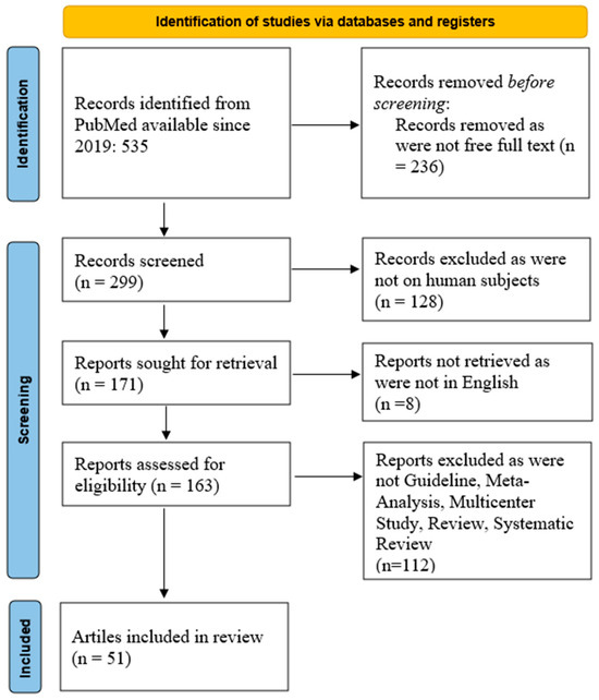 We queried the PubMed database with the key words: local allergic rhinitis. We retrieved 535 articles since 2019. From these records, only 299 articles were available for free as full text. Further restricting the search to manuscripts on human subjects, we retrieved 171 articles. From these articles, only 163 were available in the English language. Further, we restricted the search to Guideline, Meta-Analysis, Multicenter Study, Review, Systematic Review, and we included 51 articles in the current search, Figure 1. The search syntax was: ((“focal”[All Fields] OR “focalities”[All Fields] OR “focality”[All Fields] OR “focalization”[All Fields] OR “focalized”[All Fields] OR “focally”[All Fields] OR “focals”[All Fields] OR “local”[All Fields] OR “localisation”[All Fields] OR “localisations”[All Fields] OR “localise”[All Fields] OR “localised”[All Fields] OR “localises”[All Fields] OR “localising”[All Fields] OR “localization”[All Fields] OR “localizations”[All Fields] OR “localize”[All Fields] OR “localized”[All Fields] OR “localizer”[All Fields] OR “localizers”[All Fields] OR “localizes”[All Fields] OR “localizing”[All Fields] OR “locally”[All Fields] OR “locals”[All Fields]) AND (“rhinitis, allergic”[MeSH Terms] OR (“rhinitis”[All Fields] AND “allergic”[All Fields]) OR “allergic rhinitis”[All Fields] OR (“allergic”[All Fields] AND “rhinitis”[All Fields]))) AND ((y_5[Filter]) AND (ffrft[Filter]) AND (guideline[Filter] OR meta-analysis[Filter] OR multicenterstudy[Filter] OR review[Filter] OR systematicreview[Filter]) AND (humans[Filter]) AND (english[Filter])).