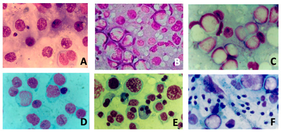Different cytological pictures (Magnification 10×) from fine-needle aspiration of testis: (A) severe hypospermatogenesis; (B) moderate hypospermatogenesis; (C) maturative spermatogonial arrest; (D) maturative spermatocytic arrest; (E) maturative spermatidic arrest; (F) normal spermatogenesis with male tract obstruction.