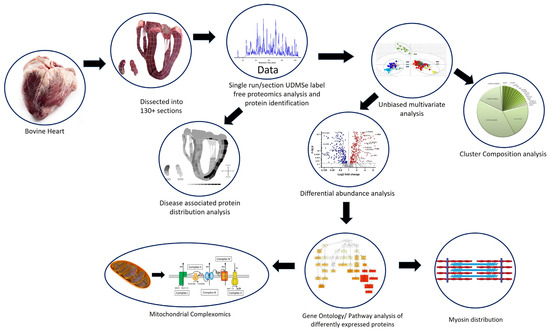 Overview of the experimental design. Source material consisted of a single bovine heart cut into >130 sections. Each section was homogenised and analysed using shotgun label-free proteomics. In total, >1000 proteins were confidently identified. Bioinformatics analysis involved mapping the abundance of known cardiac disease proteins. Unbiased multivariate analysis was used to identify regions defined by their proteome. These regions/clusters were analysed for protein composition and differential protein analysis. Differentially abundant proteins were subjected to pathway analysis, which indicated many altered functions were associated with structural protein distribution and mitochondrial function, which led to sub-analysis of the mitochondrial complexes.