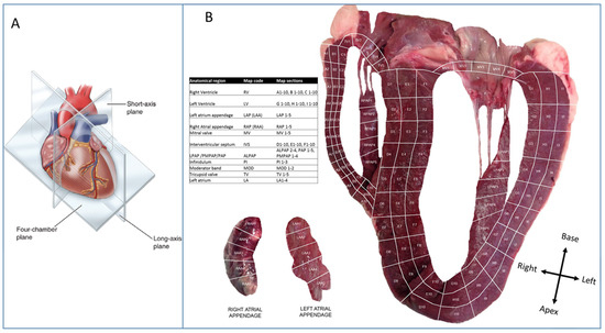 Section plan for heart map image. (Panel A): Schematic diagram illustrating how the heart was cut according to the four-chamber plane. (Panel B): The bovine heart cut, as illustrated in panel B, is sectioned as indicated in the image. Each section relates to an anatomical region that is listed in the accompanying table.