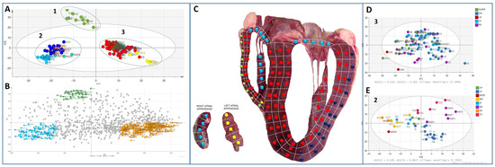 Principle component analysis (PCA) of the 131 heart regions based on their proteomic abundance profiles. (A) shows the proteomes of all sections distinctly cluster into three main groups. The first and third components segregate the heart sections and account for 19.8% and 8.7% of the variability, respectively. (B) shows the PCA analysis loading plot, showing proteins driving the separation between the three clusters. (C). Proteome map. The clustered regions depicted in A are colour-coded and mapped on the 2D image of the heart, illustrating the spatial profiling of the different proteomes (D) depicts the PCA analysis of cluster 3 proteins (excluding LAP sections), showing there is no sub-clustering of these sections, and cluster 3 is heterogeneous. (E). depicts PCA analysis of cluster 2 from A, which shows further segregation of specific anatomical regions with similar proteomes.