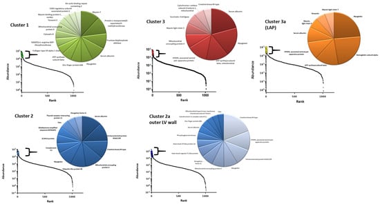 Protein abundance and dynamic range of protein abundances of the clusters and regions identified by PCA analysis. PCA clusters 1–3 are depicted. The sub-clusters of cluster 2 (LV outer wall) and 3 (LAP) are treated separately. Graphs show dynamic range by abundance versus rank. The most abundant proteins that consist of >1% of each cluster/region proteome are shown in the corresponding pie chart. Clusters 1 and 2 (including the LV outer wall) show the most heterogeneity in abundant proteins, whilst cluster 2 and LAP are dominated by myoglobin, albumin, and haemoglobin, proteins driving differences in the individual clusters of the heart proteome.