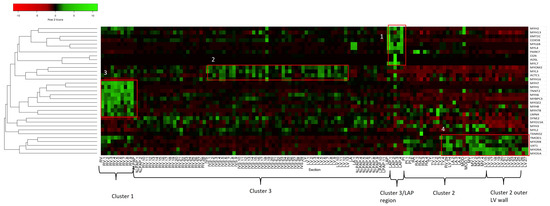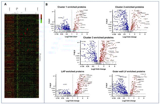 A heat map of the significant and differentially abundant proteins is shown in Figure 5A, with volcano plots used to demonstrate and compare each proteome with the rest of the other proteomes (Figure 5B). Statistical analysis comparing the sections according to the cluster indicated by the original PCA analysis showed that 445 proteins were significantly differentially abundant in cluster 1. A total of 259 of these proteins were observed to be specifically enriched compared to the rest of the cardiac proteome. Cluster 2 had 747 significantly differentially abundant proteins, of which 238 were enriched. Cluster 3 has 750 significantly altered proteins, of which 483 were more abundant in cluster 3. The sub-cluster 2A, consisting of the outer left ventricle wall, demonstrated 181 proteins significantly altered compared to all other clusters, including the rest of cluster 2. The LAP section showed 151 enriched proteins from the rest of the cardiac proteome.