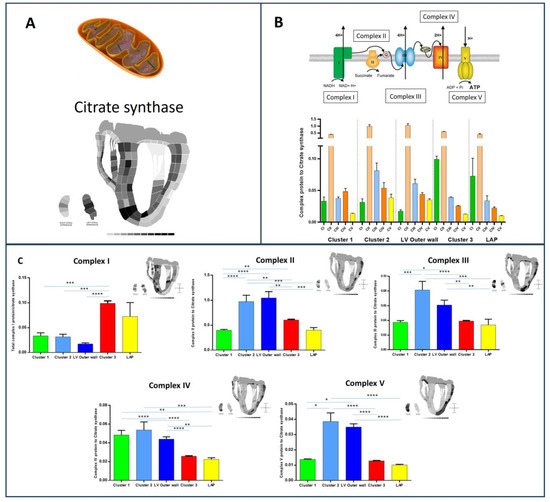 Complexomics of the bovine heart. (A) shows the total levels of citrate synthase across the heart, which indicates enrichment of citrate synthase and, hence, mitochondria in cluster 3 in the inner myocardium of the heart. (B) shows values of all complexes ratioed to citrate synthase together for each cluster to observe the pattern of abundance. The pattern of abundance of the complexes appears different in cluster I as there are higher levels of complex IV than III. As depicted in B, cluster 3 shows much higher levels of complex I. (C) shows the total detected complex protein ratio to citrate synthase for each proteome region identified in Figure 2. The abundance of each complex is depicted on the 2D map heart for each complex. There are higher levels of complex I in cluster 3, whilst there are enriched levels of complexes II–V in cluster 2 and the LV outer wall. * represents p < 0.05, ** represents p < 0.01, *** represents p < 0.001, **** represents p < 0.00001.