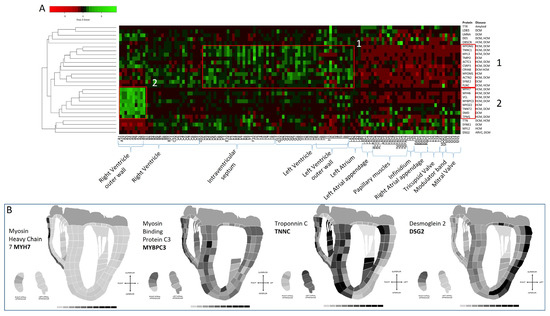 Using the proteomic data set, we selectively chose those proteins that are known to be associated with familial forms of hypertrophic (HCM), dilated (DCM), and arrhythmogenic right ventricular cardiomyopathy. The abundance data for twenty-eight proteins were extracted from the data set heat-mapped (Figure 9A) and clustered to anatomical regions to identify if there was tissue-specific distribution. Many of the disease-associated proteins had low abundance in the atrium, papillary muscles moderator band, and tricuspid and mitral valves. Many of the proteins overlap in relation to cardiomyopathy, with various mutations resulting in either HCM or DCM. However, there did not appear to be an HCM/DCM-predominant associated abundance of the proteins according to anatomical region. A higher abundance for 11 proteins indicated on the heatmap as box 1 was observed in the intraventricular septum and LV. To illustrate this, the abundance of one of the proteins, troponin C, was mapped to the 2D image of the heart in Figure 9B. Another grouping of high protein abundance was observed in the outer wall of the right ventricle, termed box 2. One of these proteins, myosin heavy chain 7, is heat mapped to the 2D heart image in Figure 9B to illustrate this. Interestingly, the heart map also shows a strong abundance of desmoglein (DSG2) in the outer wall of the left ventricle (Figure 9B). DSG2 is a specific cadherin of the cell–cell contact in cardiac desmosome and is involved in the pathogenesis of arrhythmogenic cardiomyopathy [38], which often affects the right ventricle. There have been reports that DSG2 mutations are associated with a more LV-predominant phenotype than most other gene mutations A(R)VC mutations [39]. This finding that the abundance of DSG2 is higher in the outer LV wall may explain the involvement of the LV in DSG2 ARVC. In HCM troponin I and MYBPC3, mutations have been associated in some cases with more asymmetric septal hypertrophy [40,41], which corresponds to the finding in our study that the abundance of these proteins is strong in the intraventricular septum.