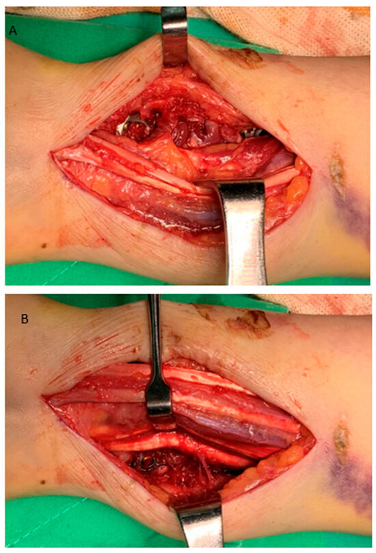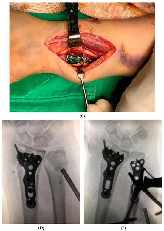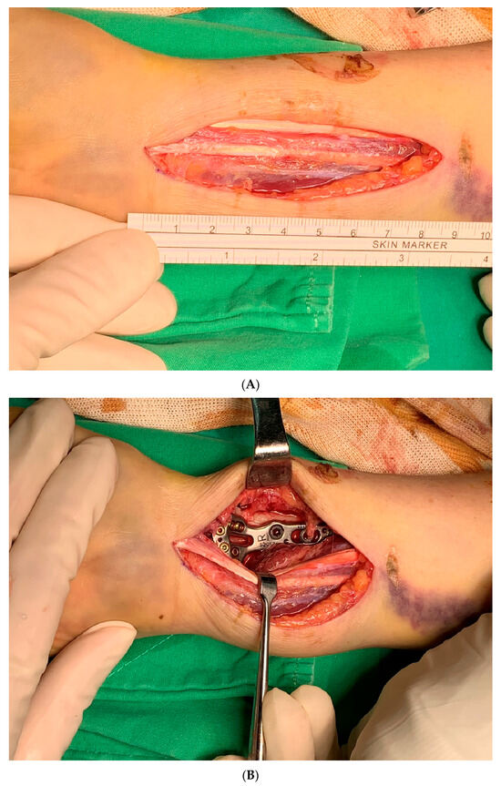 Recently, plate osteosynthesis has been widely used to fix DUFs, ensuring stability and allowing for early mobilization, thus facilitating a return to pre-injury status [16]. Most procedures have been performed using traditional approaches, such as the modified Henry’s approach for DRF and the direct lateral approach to the DUF [7,15]. While osteosynthesis shows promise, the traditional direct lateral approach has several drawbacks, including the risk of dorsal cutaneous branch of the ulnar nerve (DCBUN) injury, implant impingement, malreduction, implant failure, and arthrosis, particularly in cases of comminuted metaphyseal fractures or fractures involving the DRUJ [17,18].