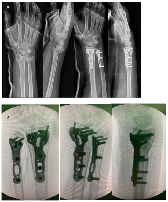 - Kurozumi, T.; Miyamoto, H.; Suzuki, T.; Watanabe, Y. Does Simultaneous Fixation of Both Distal Radius and Distal Ulnar Fractures Improve Outcomes? A Retrospective Cohort Study. Geriatr. Orthop. Surg. Rehabil. 2021, 12, 21514593211038089. [Google Scholar] [CrossRef] [PubMed]