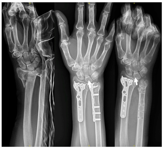 At the last follow-up, wrist flexion was 67 ± 11° and extension was 69 ± 13°. Forearm pronation was 81 ± 9° and supination was 79 ± 15°. Grip strength was 28.3 ± 11.5 kg, which was 88% of the uninjured opposite side. The mean Quick DASH score was 13.9 ± 11.5. The mean VAS during activity was 0.5 ± 0.9. The postoperative radiographic parameters were as follows: radial height: 10.8 ± 1.7 mm, radial inclination: 22.6 ± 3.7°, volar tilting: 4.0 ± 3.9°, and ulnar variance: −0.4 ± 1.4 mm. There were no cases of infection, neurovascular injury, or malreduction among these patients. However, impingement on the sigmoid notch of the radius caused by the ulnar implant, necessitating implant removal, was reported in two patients (15.4%) (Figure 4). Clinical results and radiographic parameters are summarized in Table 2.