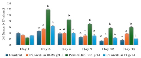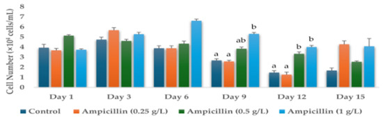 Cell numbers were determined on days 1, 3, 6, 9, 12, and 15 of the H. lacustris cultures grown in the presence of different concentrations of antibiotics—0 g/L (control), 0.25 g/L, 0.5 g/L, and 1 g/L. Cell numbers (days 1, 3, 6, 9, 12, and 15) of the H. lacustris cultures grown in the presence of hygromycin B, ampicillin, neomycin, paromomycin, tetracycline, kanamycin, chloramphenicol, streptomycin, dihydrostreptomycin sulphate, penicillin, and gentamicin are shown in Tables S1–S11. Significant results were obtained for the cell numbers of H. lacustris cultures grown with the addition of ampicillin and penicillin (Figure 1 and Figure 2). The initial cell number used for this experiment on Day 0 was 3.93 ± 0.34 × 104 cells/mL, which was the same as the control for all the samples.