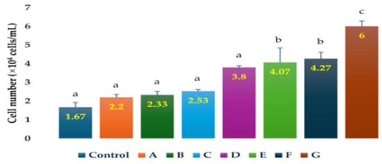 Comparison of cell numbers of H. lacustris culture samples on day 15 grown in JM without a nitrogen source with control, A-addition of penicillin (1 g/L), B-addition of chloramphenicol (0.25 g/L), C-addition of ampicillin (0.5 g/L), D-addition of penicillin (0.25 g/L), E-addition of ampicillin (1 g/L), F-addition of ampicillin (0.25 g/L), and G-addition of penicillin (0.5 g/L). Mean values that do not share the same letter are significantly different at p < 0.001.