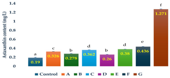 Comparison of astaxanthin accumulation by H. lacustris culture samples on day 15 grown in JM without a nitrogen source with control, A-addition of penicillin (1 g/L), B-addition of chloramphenicol (0.25 g/L), C-addition of ampicillin (0.5 g/L), D-addition of penicillin (0.25 g/L), E-addition of ampicillin (1 g/L), F-addition of ampicillin (0.25 g/L), and G-addition of penicillin (0.5 g/L). Mean values that do not share the same letter are significantly different at p < 0.001.