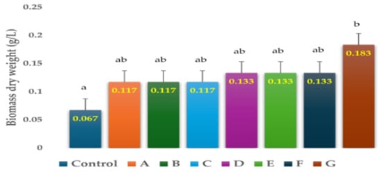 Comparison of biomass dry weight of H. lacustris culture samples on day 15 grown in JM without a nitrogen source with control, A-addition of penicillin (1 g/L), B-addition of chloramphenicol (0.25 g/L), C-addition of ampicillin (0.5 g/L), D-addition of penicillin (0.25 g/L), E-addition of ampicillin (1 g/L), F-addition of ampicillin (0.25 g/L), and G-addition of penicillin (0.5 g/L). Mean values that do not share the same letter are significantly different at p < 0.001.
