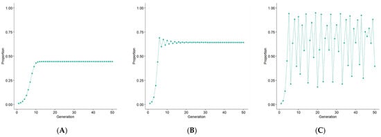 where P is the proportion of the potential maximum population size, either at time t or t + 1, and r is a growth parameter that determines the population change. Therefore, P must be a number between 0 and 1 and can be regarded as a proportion of the maximum achievable population size. The behavior of the function is essentially dependent on the value of r. For any value between 0 and 1, the population will eventually become 0, while between 1 and 2, it will converge to , regardless of the initial population size. With r between 2 and 3, the function starts to exhibit more complex behavior, and while it still converges to , it first fluctuates around the value for several generations. For any value above 3, oscillations will arise, initially between two values, then four, and at r ≈ 3.56995, the function starts to exhibit chaotic behavior [] (see Figure 1A–C).
