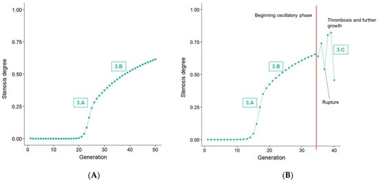 Hypothetic models of a stable, asymptomatic plaque (A) and an unstable, potentially symptomatic plaque (B). A–C refer to corresponding plaque illustrations in Figure 3. Parameter r increases in both examples, by a constant factor for each generation (0.05 in (A) vs. 0.08 in (B)). The red line in (B) marks the beginning of the oscillatory phase that reflects a disease stage where patients are at risk of cardiovascular events due to unstable plaques.