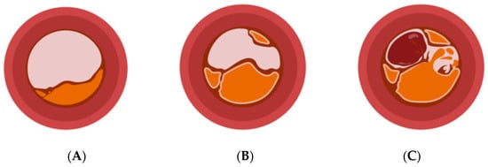 Unstable plaques are defined by values of r > 2. A reduction in P indicates the beginning of oscillations observed at this growth rate. This, in turn, corresponds to plaque erosion or rupture, increasing the lumen size—if only for a thin layer of cells, as seen for cap erosion—but, at the same time, exposing the thrombogenic material inside the core and resulting in thrombosis, which, in turn, can cause both thrombotic occlusion or embolization to more peripheral arteries. Correspondingly, healing plaques have been observed to incorporate thrombi, thereby significantly increasing in size, also referred to as constrictive remodeling [], which is ultimately captured by a subsequent increase in P that equals the oscillatory phase at r > 2 (see Figure 2B). The oscillatory phase in the model correlates with observations from clinical studies that have reported repeated erosion/rupture and healing with accelerated luminal stenosis prior to clinically detectable events [,,]. Illustrations of atherosclerotic plaques in different development stages are shown in Figure 3. Within the proposed model, the distinction between symptomatic and asymptomatic disease can, therefore, be illustrated by margins of r, i.e., net plaque progression, which leads to the question of how this can translate into clinics and augment risk stratification protocols.
