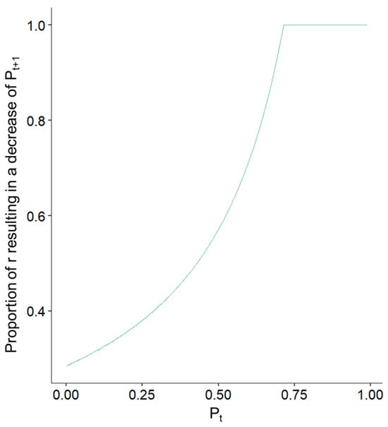 The model also captures well why plaques of a higher stenotic degree are more likely to induce clinical cardiovascular events. Atherosclerotic plaques become more sensitive and vulnerable to rupture as they increase in size. With an increase in P, the proportion of potential values of r resulting in Pt+1 < Pt increases approximately exponentially until reaching its maximum of 1 around 0.7. As P increases, there are less and less values for r that fulfill the condition Pt < Pt+1. In other words, the logistic map inherently becomes unstable in that region, and the bigger Pt becomes, so does the probability of instability depicted by Pt+1 < Pt (see Figure 4). This would indicate that, around a stenosis of 70%, ruptures or at least erosions become inevitable and correspond to the clinical guideline recommendation for prophylactic atherectomy in the case of 70% asymptomatic carotid artery stenosis due to its elevated risk of causing events. Similarly, 70% stenosis is frequently considered as severe in coronary arteries and prone to induce myocardial infarction []. However, this does not mean that every rupture or erosion predicted under the logistic-map-based model must result in a clinically observable event, i.e., not every plaque with a stenotic degree >70% must become symptomatic. It has been previously observed that, while most clinical events stem from ruptures, not all ruptures must cause an event (the difference between necessary and sufficient conditions) [].