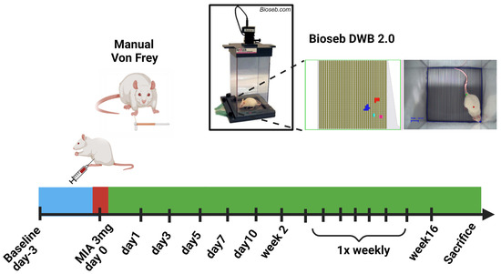 Experimental Timeline. Baseline pre-injury measurements were conducted 3–5 days before OA induction. At day 0, female Sprague Dawley rats were injected in the right knee joint with monoiodoacetate using X-ray guidance. Manual Von Frey and dynamic weight bearing (DWB) analyses were conducted on day 1, day 3, day 5, day 7, day 10 and day 14 and weekly thereafter until 16 weeks. Created with Biorender.com (accessed on 4 August 2024).