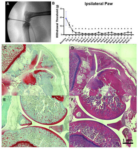 Persistent mechanical allodynia and unilateral knee joint degeneration in the MIA model. (A). An X-ray image of a 29-gauge insulin syringe injected into the right knee joint of a rat. X-ray guidance allows visualization of the injection location and enhances the precision of injections. (B). Manual Von Frey measurements in MIA-injected rats show significant pain sensitivity from day 5 onwards and persistent mechanical allodynia for 16 weeks. The blue symbol corresponds to baseline measurements. Significance denoted by ‘*’ p< 0.05, with repeated measures one-way ANOVA. (C). Safranin-O-stained section of ipsilateral knee joint at 16 weeks. (D). H&E-stained knee section for ipsilateral knee joint at 16 weeks. Stained sections show that the ipsilateral joint is severely degenerated with cartilage degeneration and growth plate disruption (C) and infiltration of inflammatory cells (D). (E). Safranin O-stained section of contralateral joint at 16 weeks. (F). H&E-stained section of contralateral knee at 16 weeks. The contralateral joints show a preserved cartilage layer, indicating that MIA-induced osteoarthritis led to a unilateral knee OA.