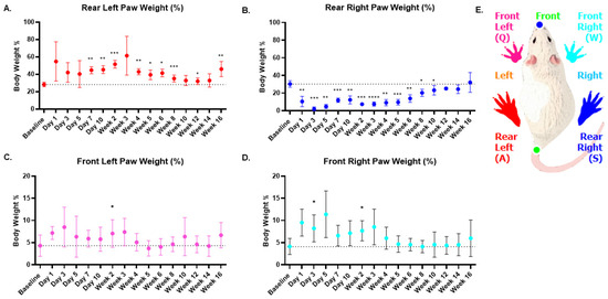 Weight bearing percentages of all four rodent paws. (A). Weight bearing by the rear left paw (contralateral) for 16 weeks. (B). Weight bearing by the rear right (ipsilateral) paw for 16 weeks. (C). Weight bearing by the front left paw for 16 weeks. (D). Weight bearing by the front right paw for 16 weeks. (E). The illustration indicates the color legend coding for each of the paws. The rear right (ipsilateral) weight percentage shows significant reduced weight bearing compared to pre-injury levels for 10 weeks. The contralateral weight percentage shows increased weight bearing and displays significant differences compared to baseline for 16 weeks using repeated measures one-way ANOVA and Dunnett’s multiple comparison test. Significance denoted by ‘*’ p < 0.05, ‘**’ p < 0.01 and ‘***’ p < 0.001 and ‘****’ p < 0.0001.