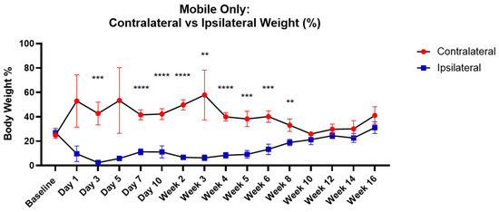 Comparison between contralateral and ipsilateral paw weight percentages at specific time points. The figure compares the contralateral and ipsilateral weight percentages at each specific time point, with the mobility threshold applied.There were significant differences in weight bearing between the ipsilateral (rear right) and contralateral paws (rear left) from day 3 to 8 weeks. Significance denoted by ‘**’ p < 0.01, ‘***’ p <0.001 and ‘****’ p <0.0001 with two-way ANOVA with post hoc paired Student’s t-test with False Discovery Rate (FDR) approach for multiple comparisons.