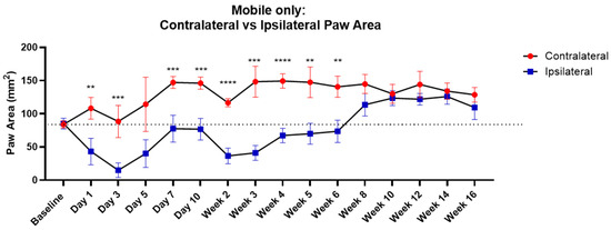 Comparison of contralateral and ipsilateral paw area at specific time points. The figure displays the contralateral paw area and the ipsilateral paw area at each specific time point, with the mobility threshold applied. The ipsilateral (rear right) paw area showed significantly reduced paw area at time points day 1, day 3 and day 7, which corresponds to a behavior pattern of rodents protecting their injured paws during this acute time period post injury. The comparison of ipsilateral (rear right) and contralateral (rear left) paw area showed significant differences for 6 weeks despite animal growth over time. Significance denoted by ‘**’ p < 0.01, ‘***’ p < 0.001 and ‘****’ p < 0.0001 with two-way ANOVA with post hoc paired Student’s t-test with False Discovery Rate (FDR) approach for multiple comparisons.