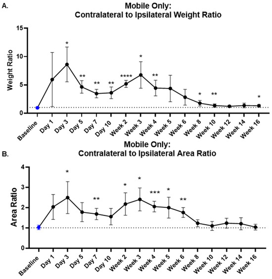 Weight Ratio and Area Ratio. (A) The plot displays the contralateral/ipsilateral weight ratio from the rodents’ weight bearing analysis with the mobility threshold applied. The blue symbol corresponds to the baseline measurements. The weight ratio was able to show significant difference from baseline behavior for 16 weeks. The weight ratio shows bimodal temporal changes, with the first peak at day 3 and the second peak at day 21. (B). The plot displays area ratio with contralateral and ipsilateral paw area. The area ratio also shows bimodal changes, with peaks at day 3 and day 21. Significance denoted by ‘*’ p < 0.05, ‘**’ p < 0.01, ‘***’ p < 0.001 and ‘****’ p < 0.0001 with repeated measures one-way ANOVA and Dunnett’s multiple comparison test.