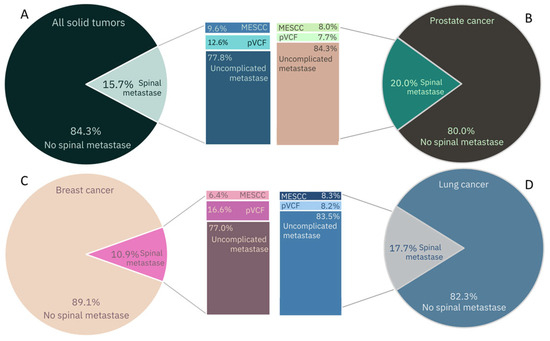 Epidemiology of spinal metastases, metastatic epidural spinal cord compression (MESCC), pathologic vertebral compression fractures (pVCF) in solid tumors. (A) All solid tumors. (B) Lung cancer. (C) Breast cancer. (D) Prostate cancer [5].