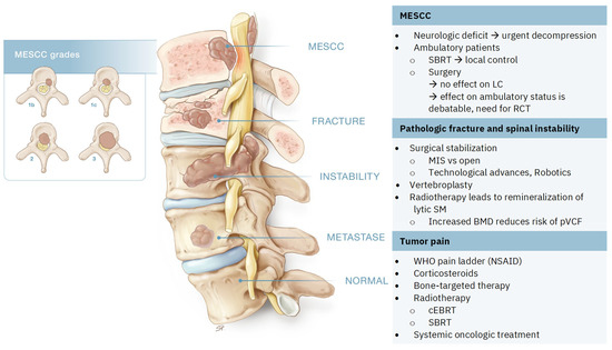 Awareness of potential SM and defining the type of pain (biological, mechanical, and/or radicular (MESCC)) for each involved vertebra is the first and most important step in the treatment of SM-related pain. Early diagnosis and timely treatment could prevent further deterioration, for example, Denosumab or bisphosphonates preventing the progression of lytic SM and pathologic fractures; timely radiotherapy providing local control, preventing symptomatic spinal cord compression and leading to remineralization of lytic SM; or timely surgical stabilization preventing significant pathologic fractures with invalidating pain or neurologic deficit or urgent surgery to decompress the spinal cord in cases of neurologic deficit or gait disturbances.
