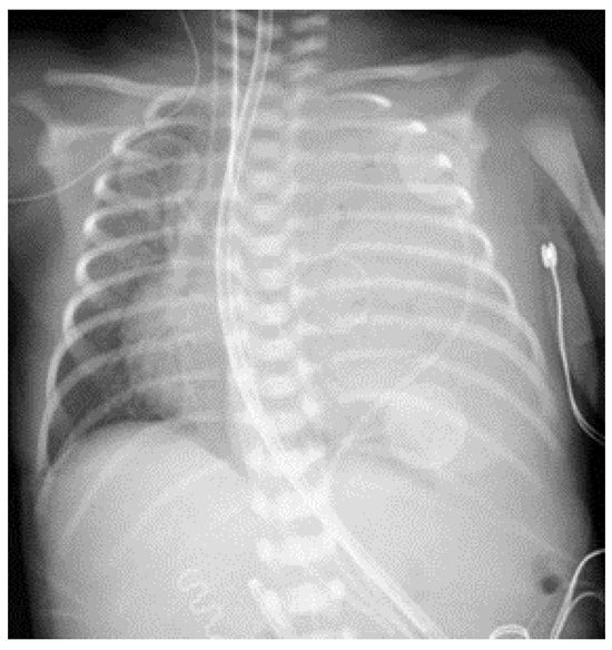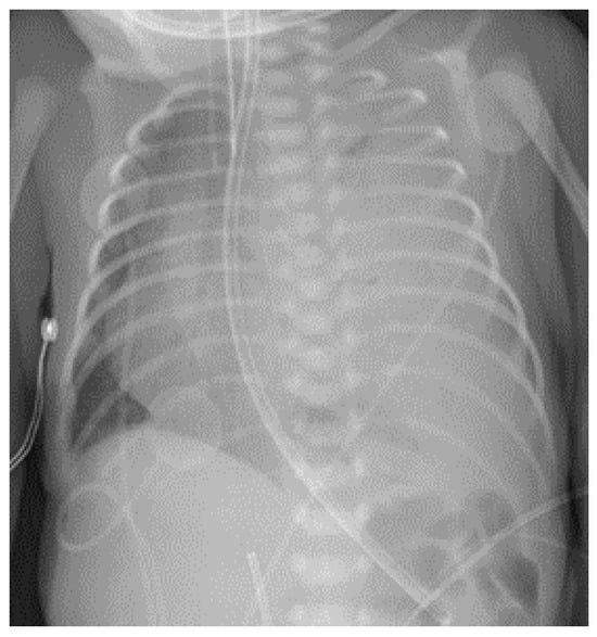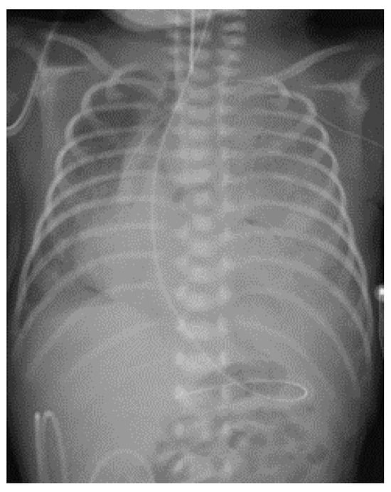 On the 7th day of life, the general conditions of the patient started to improve, and it was possible to shift him onto conventional mechanical ventilation. On the chest X-ray, the superior lobe was slightly more ventilated compared to the previous one (Figure 5). The patient was therefore extubated on day 16 of life and subsequently supported by non-Invasive Mechanical Ventilation (nIMV) for the following month. Eventually, nCPAP was used and, finally, low-flow oxygen.
