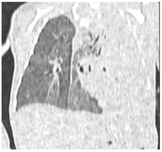 On day 3 of life, a flash CT scan with contrast medium was performed. It showed a hypodense and homogeneous left lung mass, likely belonging to the superior lobe and the lingula, with small areas of spared tissue due to less alveolar and interstitial involvement, an air bronchogram with hypertrophied bronchi, and no abnormal vessels feeding the mass (Figure 3). Small ground-glass parenchymal opacities were observed also within the right lung (Figure 4). The left inferior lobe result was partially spared and antero-inferiorly compressed by the lesion, and the mediastinum was shifted. Based on this imaging, it was not possible to distinguish between a CPAM and a pleuropulmonary blastoma. An initial surgical approach was considered. However, the patient over the next few days remained stable without requiring any further increase of the respiratory parameters. Therefore, the surgeons and neonatologists decided on a wait-and-see approach with strict bedside US follow-up. On US, the following features were recognizable: normal sliding, thickening of pleural lines, confluent B-lines, and hyperechogenic areas of the left lobe. No pleural effusion was detected.