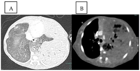 At birth, most patients are asymptomatic or pauci-symptomatic, and a long-standing debate on the timing and best approach is present in the literature []. If a CCAM, BPS, or BC are confirmed, the infant should undergo surgery within the first year of life. A minority of surgeons suggest a conservative approach in asymptomatic patients [], but non-operative management is still controversial []. In rare cases, newborns are symptomatic [], and, upon confirmation of diagnosis by means of radiological imaging, they should rapidly be addressed.